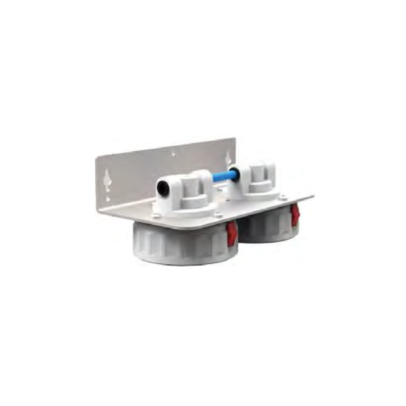 Due testate portafiltro collegate in serie, complete di staffa di fissaggio, con ghiera e fermo di blocco.